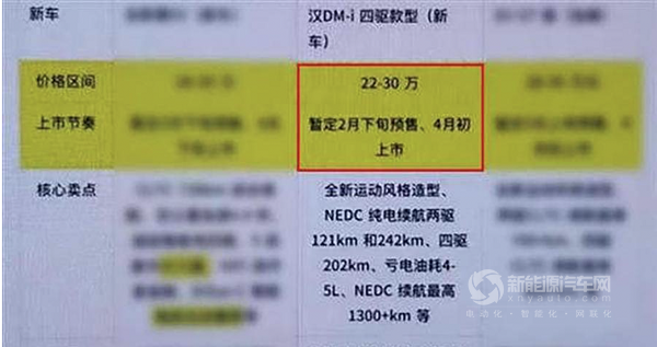 日前,我们从相关渠道获取到了有关比亚迪汉DM-i车型的新车上市节奏和预售价区间信息。据悉,汉DM-i预计会在2月下旬开启预售,并且会在4月初上市,而价格区间有可能会在22-30万元之间,相比高性能版车型,售价进一步下调。此外,除了两驱版外还新增了四驱版车型可选。