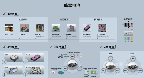 为了实现电池包在全生命周期的安全性,江淮钇为基于圆柱电芯进行了蜂窝仿生学的设计,通过10余年的迭代研发,经过机理探索、迭代开发、技术固化3段历程,上万次电池爆炸试验、20万辆实车验证以及百亿公里实践开发出蜂窝电池技术,真正意义上实现了永不自燃。
